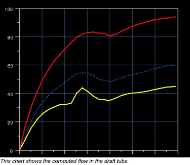At the maximum efficiency point, the gain comes from the improved flow both in the runner and in the draft tube elbow. In the draft tube, analysis results showed that the eddy in the elbow was gone. In the runner, the effect of the eddy is reduced. The maximum efficiency point is shifted to the right and gives an additional 7.8 MW to the 195 MW nominal unit with 1.5% more efficiency. (Return to Table of Contents)