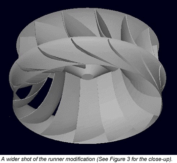 Analysts then suspected the problem resided in the turbine itself. Because the flow remained uniform in the distributor, they modeled a section of the distributor for flow simulation and loss computations. To investigate the flow in the runner, they measured two hydraulic passages on site. To measure the surface data of critical parts (leading and trailing edges and complex surfaces of the blade), they used a mechanical digitizing arm. (Return to Table of Contents)