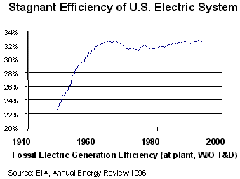 According to USCHPA's vision for the future, "On average, two-thirds of the fuel used to make electricity in the United States is wasted. While there have been impressive energy efficiency gains in other sectors of the economy since the oil price shocks of the 1970s, the average efficiency of power generation in the United States has remained around 33% since 1960."
