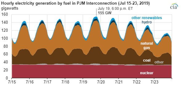 For the past few years, natural gas-fired power plants have been dispatched in PJM at higher levels during periods of increased demand. On July 19, in the hour ending 6:00 p.m. ET, PJM dispatched a total of 155 GW, 66 GW (or 43%) of which was met by natural gas-fired generators. In comparison, 43 GW of coal-fired generation capacity, the second-highest fuel source on that day, was dispatched in that hour.