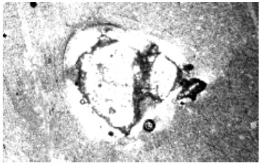 Minerals such as quartz, anhydrite, and iron oxides are easily identified. PLM also allows the observer to use lower magnifications than the electron microscope. This allows you to see a "bigger picture" of the deposit. The use of PLM also allows you to see the internal structure of the deposit. This portion of the analyses will take only a few minutes, but you get a large amount of data.